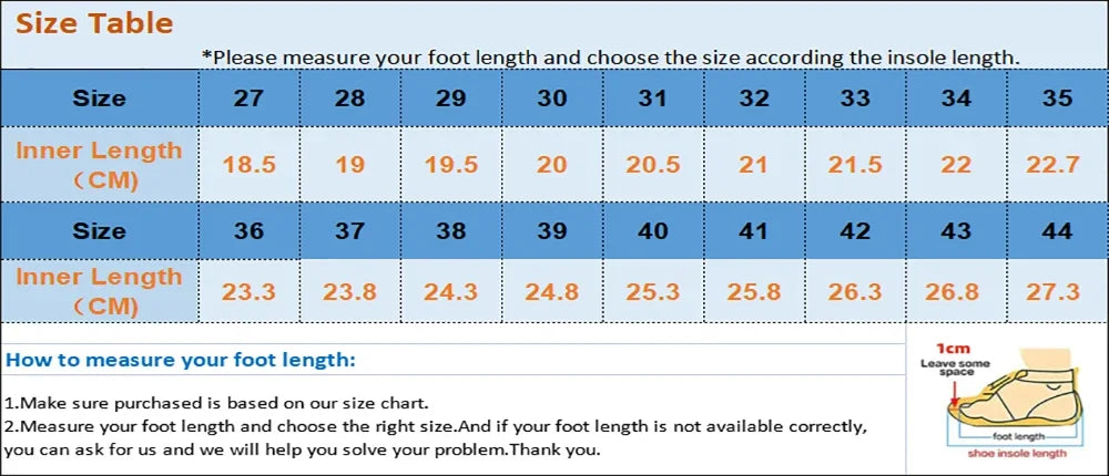 Shoe Size 38 (inner 24.6cm), 40 (inner 26cm), 39 (inner 25.3cm), 42 (inner 27.3cm), 41 (inner 26.6cm), 43 (inner 27.9cm), 32 (inner 21.5cm), 31 (inner 21cm), 30 (inner 20.5cm), 28(inner 19.5cm), 29(inner 20cm), 36 (inner 23.5cm), 35 (inner 23cm), 34 (inner 22.2cm), 33 (inner 22cm), 37 (inner 24cm)